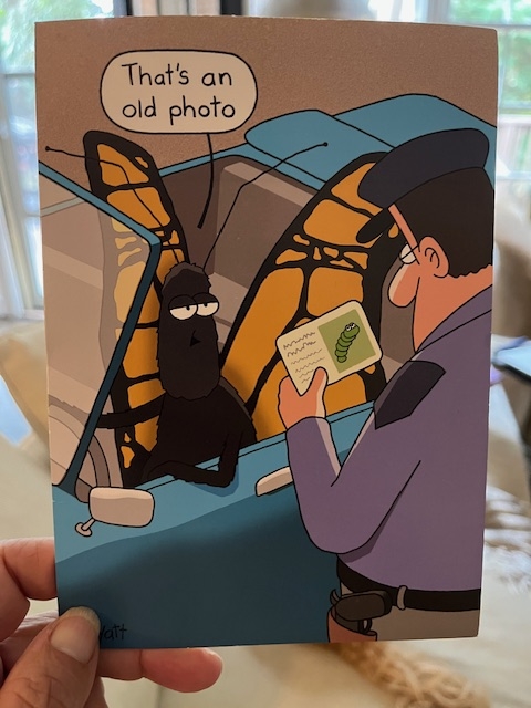 Good morning... Going through old boxes of old stuff in our basement, I came across this old card. I chuckle every time I look at the butterfly driving a car with a caterpillar on her driver's license. She sheepishly tells the officer, who has pulled her over, "That's an old photo." This old card came to me when [...]